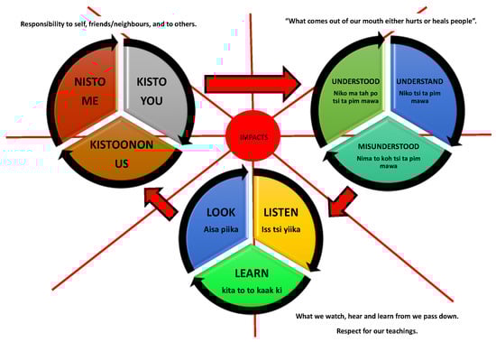 Blackfoot Trilogy of Teachings—this trilogy shows the complex manner in the reconsideration of child protection assessment and judicial decision making that will be explored. It requires that we self-examine and do so in relationship with others. This will result in the constant circle of moving from misunderstanding to feeling that something is understood to truly understanding. The more one understands, the more one comes back to misunderstanding and so it is a loop. It is therefore a process of looking and listening to learn. The process also demands that we are conscious of our statements (such as presenting evidence to the court and in judicial decision making). At the center is the recognition of the multiple intersections in this work and the reality that impacts are constant.