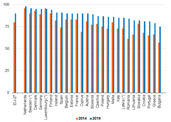 Internet access of households (% of all households, 2014 and 2019) (EUROSTAT 2021b).