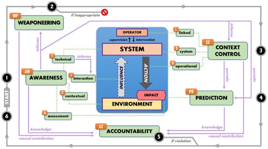 [→,] is a more substantial process but very intuitive. For a commander to make a proper weaponeering decision, they “must be fully informed as to [their] tactical options, as well as the anticipated consequences of implementing these precautions” (). Thus, a solid understanding of all three Awareness facets is required: [→] the weapon’s abilities, parameters and limitations, [→] the situation on the ground, based on collected ISR, and [→] how it will perform concretely in these conditions (; ). Similarly, specific Context Control actions also rely on the information provided by []. () confirmed that “[c]ontext matters when considering appropriate control measures. The nature of the task and the environment should have major implications for how control is implemented”. A particular example by () illustrates how [] directly impacts [], even in negated form. He postulates that if a commander has great difficulty with [] (e.g., it uses an extremely advanced or non-transparent AI that is difficult to comprehend), they would be more “inclined to restrict its use due to a lack of understanding of how the system would respond to circumstances (predictable or not) and what effects it would generate”. In other words, deficiencies in [] can be compensated by greatly intensifying [].