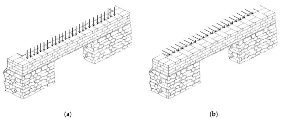 - Borri, A.; Castori, G.; Grazini, A. Retrofitting of masonry building with reinforced masonry ring-beam. Constr. Build. Mater. 2009, 23, 1892–1901. [Google Scholar] [CrossRef]