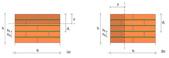If the masonry beam is subjected only to loads parallel to the bed joints, clay bricks and flax fibers are loaded differently with respect to the previous case. The neutral axis y (measured from extreme compressive fiber) is computed by the following equation (Figure 2b), being the beam subjected to pure bending: