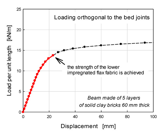 Figure 5 shows the load-displacement curve (computed at the mid-span) of a beam made of five layers of solid bricks 60 mm thick (and then four layers of impregnated flax fibers) subjected to loads orthogonal to the mortar beds (vertical loading).