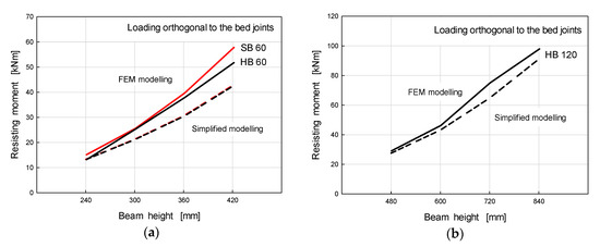 Figure 7 shows the resisting bending moments in beams made by several brick types and loaded orthogonally to the bed joints (bending in vertical planes). The moments are plotted as the beam height (that is, the number of brick layers) varies. The continuous lines show the bending moments provided by the FEM model analysis, the dotted lines the ones obtained by the simplified procedure. The red lines represent solid brick masonry (SB), the black lines hollow brick masonry (HB).