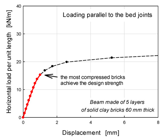 Figure 8 shows the load-displacement curve (computed at the mid-span) of the same beam of Figure 5 and Figure 6 subjected to loads parallel to the mortar beds (horizontal loading). The Figure shows the load level at which the most compressed bricks reach the design compressive strength: beyond this threshold, the response of the beam is no longer linear and the horizontal displacements increase rapidly. Such a threshold also corresponds to the failure condition used in the simplified method.