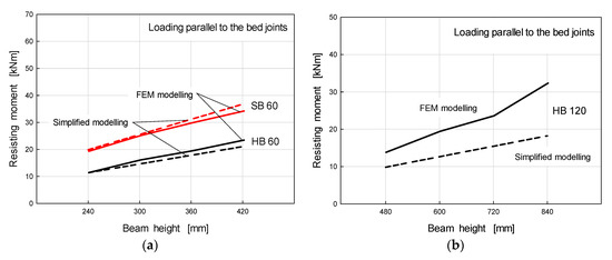 Figure 9 shows the resisting bending moments in beams loaded in the direction parallel to the bed joints (bending in horizontal planes). The curves show that, in this case, the two design approaches lead to similar values for beams made by solid or hollow bricks 60 mm thick (Figure 9a), and different values in beams made by hollow bricks 120 mm thick (see Figure 9b).