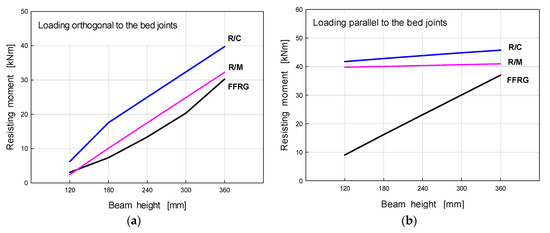 The comparison of Figure 10a (bending in vertical planes) shows that the masonry beams reinforced by flax fibers have slightly lower resistant moments than the other ones. The resisting moments rise with increasing the beam height because of the increasing number of fiber layers with the beam height for FFRG and the larger bars centrifugation for R/M and R/C.