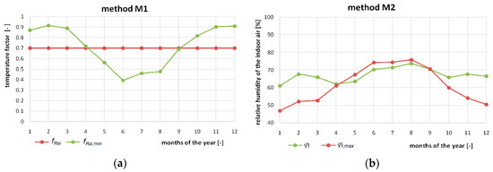 Based on the design condition, it is possible to determine the difference between temperature factors in the following months of the year: ΔfR = fRsi−fRsi,min. A positive value (ΔfR > 0) means no risk of mold growth but also shows a reserve of safe barrier function. However, a negative value (ΔfR < 0) means a threat of mold growth and shows the depth of this phenomenon in the critical month and other months.