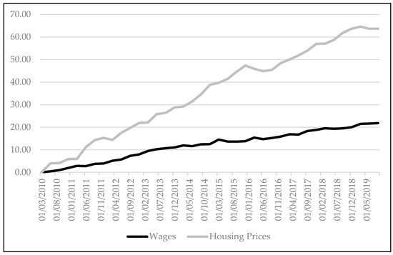 In Chile, housing is legally considered a commodity and a good investment as it is a low-regulation market that is organised by real estate market agents, with housing subsidised by the state for lower-income households [1]. Despite public policy efforts, there is strong evidence that demand-side subsidies for low-income housing projects have ended up increasing the price by contributing to inflation [2]. This also occurred for urban renewal subsidies, which were initially intended for the middle class, where the subsidy was capitalised by companies that sell housing units, obstructing direct benefits to buyers [3]. On the one hand, the high value of housing has been explained by actors in the Chilean real estate sector as being a consequence of the high value of land and its scarcity [4]. On the other hand, in Greater Santiago, where the price of housing has risen the most, the argument on a shortage of land has been contested, indicating the existence of 555 hectares of land located in the urban pericentre of the city that is still available to exploit [5]. Even so, the amount of available land would exceed the structural demand of 497,560 housing units, which is a very similar situation to the 1998 deficit of 497,012 units [6]. All of this is despite the fact that from 1998 to December 2018, 2,805,069 new housing units were built [7]. The contradiction between high deficit and high production of housing units requires further discussion. Since 2010, the real housing price index has risen by 63.69%, while workers’ wages have only increased by 21.85% (Figure 1).