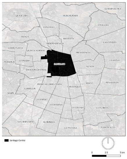 The borough of Santiago (Figure 2) corresponds not only to the CBD but also to the historical centre of the capital of Chile [19]. This condition had allowed it to attract the highest amount of urban workers [20]. It is located in the centre of the Greater Santiago, and it concentrates the political centre of the nation, such as the main ministries, public services and the government palace. Its area is approx. 23 km2 and its population are 404,495 inhabitants, according to the National Population Census 2017. Moreover, Santiago concentrates on a significant quantity of recent developments as a consequence of the earthquake of the year 1985, in the first instance, and of the aggressive process of urban renovation initiated in the year 2000 [21].
