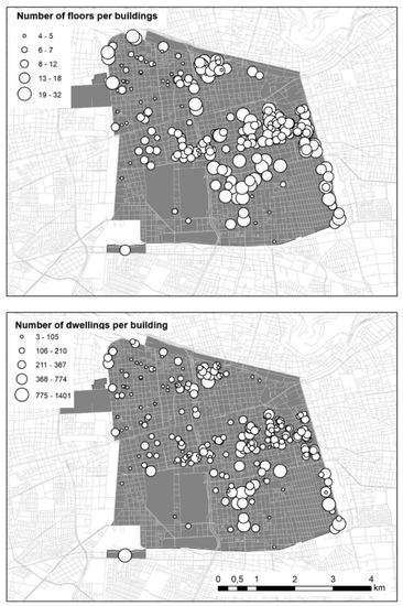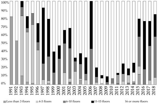 For the earthquake of 1985, Santiago suffered multiple damages in the buildings, at that moment mainly made of adobe, whose reconstruction took years due to the delicate economic situation of the country in those years [22]. After the beginning of the transition to democracy, which begun in 1990, a repopulation plan was implemented that provided special subsidies for the purchase of apartments in the commune [23]. This plan made it possible to occupy a large part of the land that had become vacant after the earthquake and generated significant pressure for the purchase of land for the construction of buildings. The typologies of these buildings varied over the years. First, constructions of up to five floors were built, and later, works on higher buildings were started. As can be seen in Figure 3, there has been an increase in the heights of the approved building, highlighting that after 1995, buildings with less than three floors disappeared. In contrast, from 1995 to 2015, most records indicate that buildings of more than 16 floors predominated, marking a trend in the process of verticalisation of the city.