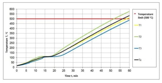 Sample No. 10, as the best variant, was used in large-scale fire tests for fire resistance effectiveness in accordance with GOST 53295-2009 []. The tests were performed in a steel column (section factor 3, 4) in the fire standard curve mode. Time for the limit state of 500 °C of the sample was registered in the tests (Figure 7). The time is equal to 65 min, corresponding the 4th group of fire resistance.