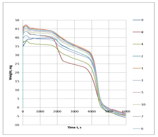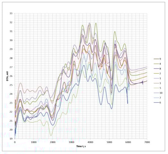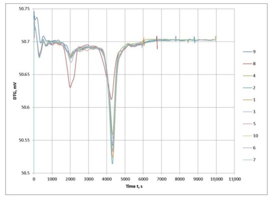 Consider the impact of the physical and chemical properties of the intumescent coating on its fire protection properties on the example of the test paint. The tested fireproof paint is a composition of fire retardants, with a binder on the basis of polyvinyl acetate and modifying additives. Raw components of fire-retardant materials are widely represented in the market by a variety of manufacturers and suppliers and are readily available. At the same time, however, the quality characteristics of seemingly the same chemicals often differ. Comparative thermal studies of different brands of PFA (Figure 2, Figure 3, Figure 4 and Figure 5) presented on the raw materials market have been conducted. PFA exist in two types: with crystal phase I (degree of polymerization n < 1000) and crystal phase II (n > 1000). The first type is characterized by a linear structure, lower decomposition temperature, and high degree of water solubility; so, in the production of fire protection paints, a phase II polyphosphate with a high degree of polymerization is used. Ten PFA samples from the different manufacturers present in the market were chosen for the investigation.