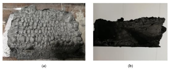The foam crusts No. 9 and No. 10 are shown in Figure 6. Sample 9 is characterized by a low intumescent coefficient—42. The heat-insulating layer of Sample 10 is more stable and denser, with an intumescent coefficient of 67.