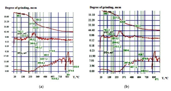 However, when introducing any components into the paint formulation, it is necessary to assess their impact on the fire protection properties of the coating [,,,,]. In order to assess the effect of orthophosphoric acid on the fire protection properties of the tested fireproof paint, a comparative thermal analysis was carried out. Two formulations were studied: without acid introduction and with 1% acid content by weight. A derivatograph device was used for the complex thermal analysis; it was the basis for the automated thermal analysis installation with the computer applications. Quantity of the substance—0.05 g; inert compound—aluminic oxide; atmosphere—air; temperature increase rate—10 °C/min; temperature interval of the test—20–950 °C; and thermoscale sensitivity—0.10 mg. In Figure 8a,b, the thermograms of the tested fireproof paint samples are presented, and in Table 3 and Table 4 the conclusions on these graphs are given.