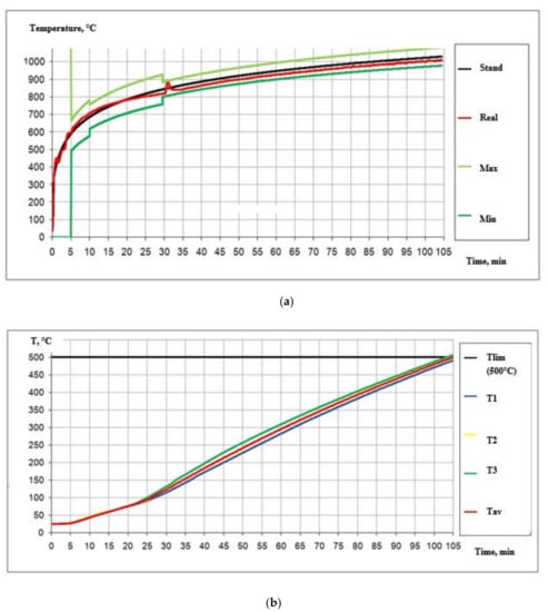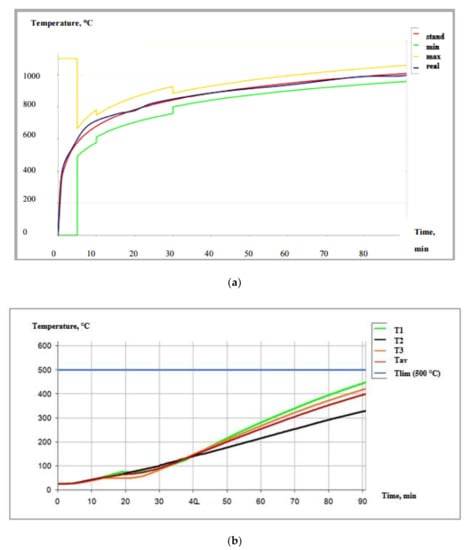 (a) The temperature regime of the tests GOST 30247.1-94 []. (b) Structure heating during the test according to GOST 30247.1-94 [].