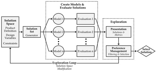 Following the model creation and solution evaluation in our generative design framework is the exploration approach itself. Because the generated solution set can be considerable in size, and in order to support users in the identification of potentially novel solutions, the generated solution set needs to be explored [2,10]. The objective of the exploration is to probe a set of solutions to identify interesting regions of solutions. The outcome should either be a solution or a set of solutions deemed satisfactory to end the generative design process, or a set of modifiers sent back to the solution space and generator to generate a new set of solutions. This consists of two stages: presentation and preference management.