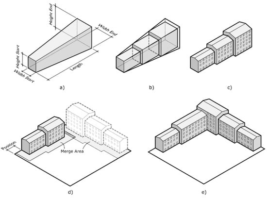 Outline of the building generation technique used in the case study, where (a) shows the definition of the building’s bounding shape, (b) shows the fit of cuboids into the bounding shape, (c) shows the initially generated building(s), (d) shows the positioning of the building(s) and merge areas, and (e) shows a scenario where two adjacent buildings are merged.