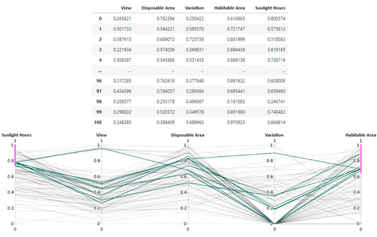 In the presentation stage, the solutions and their metrics are presented to the user for their evaluation. Here, visualization plays an important role, as it allows for the transformation of data into, as described by Chien and Flemming [24], “concrete objects that can be seen”. The visualization aspect is especially important in an architectural design context as it central to its practice [25], and the representation of solutions should also be given consideration in a generative design approach. The role of the presentation is to swiftly and clearly relay relevant information to the users about each solution and its metrics in such a way that the users are assisted in making well-informed decisions. This entails a combination of 2D or 3D visualizations of a product’s geometry (e.g., through images, renderings, or models) and graphs and tables that describe the product’s attributes and properties.