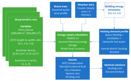 The main goal of the present study was to show the technical and economic feasibility of borehole thermal energy storage as a supplementary heating system in Finnish district heating grids, where large enough waste heat streams are available. The study also aimed to explain why certain solutions are more cost-effective than others, taking into account the cold Finnish climate and the local ground properties. The novelty of the paper was in the integration of a waste heat process into the district heating system through seasonal storage. No such system yet exists in Finland, but due to the widespread use of district heating and waste-to-energy processes, the potential for reducing carbon dioxide (CO2) emissions is great. Previous studies on the topic did not report the cost of heat produced through the seasonal waste heat storage system. In this study, we explicitly report the levelized cost of heat obtained from a BTES system. Both the emission reduction potential and its cost are novel and useful information for Finnish and Nordic district heating operators. Paste experimental studies analyze just a single storage system configuration, which may or may not be optimal. The parametric runs performed in the study show the performance range and tradeoffs available for optimal waste heat storage systems, which was not presented in the previous studies.