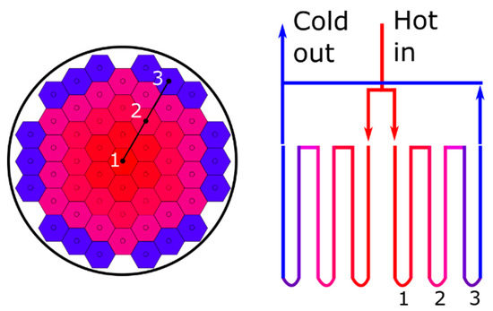 The boreholes in the BTES system were distributed uniformly in a cylindrical volume. Some of the boreholes were connected in series, such that the hot water for charging was fed into the center of the storage and taken out at the outside edge, going through several boreholes in the process. During discharging, the flow direction was reversed, such that cold water was supplied from the edges. A higher number of series-connected boreholes increases heat transfer efficiency, while reducing the total flow rate and power. It also creates a larger radial temperature difference in the storage, reducing heat losses. This is visualized in Figure 2, which shows a borehole field and the principle of series connection between boreholes (in charging mode).
