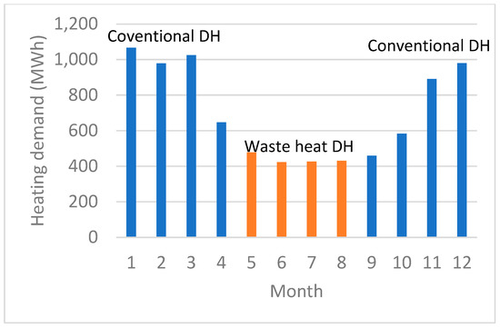 Monthly heating demand in the residential district without seasonal energy storage. The blue color shows when heating is provided by conventional district heating and the orange shows when waste heat is directly utilized.