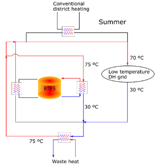 In summer (Figure 4), waste heat was supplied directly to the low temperature heating grid and to charge the BTES. In winter (Figure 5), the return flow from the local grid was preheated using the BTES and then heated to the required temperature level (70 °C) with the conventional district heating. Heat transfer and losses in the district heating pipes were not modelled, only the connection between the BTES and other grids was modelled. The carbon dioxide emission factor of the conventional district heating was assumed to match the national average of 194 kg-CO2/MWh [17]. Heat produced by otherwise wasted incineration heat was assumed to have no emissions.