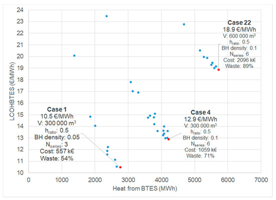 The solutions were arranged according to LCOH and BTES heat utilization and the three highlighted solutions were selected based on the Pareto optimality concept. A Pareto optimal solution is one where one property of a solution cannot be improved without making another worse. Thus, three points were chosen by trying to minimize LCOH and maximize BTES heat at the same time. Details of the highlighted solutions are reported in Figure 6.