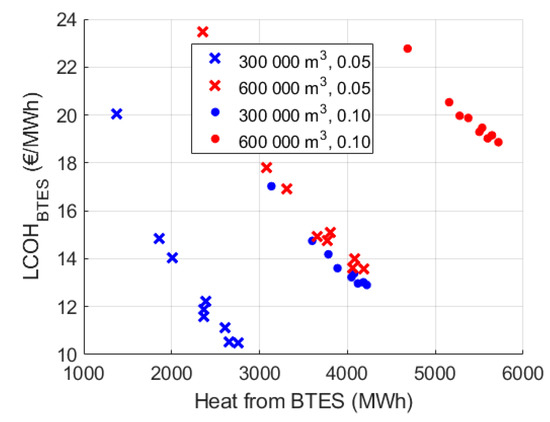 The figure shows three clusters of solutions, which are analyzed further in the following paragraphs. The levelized cost of heat was determined for all cases. Figure 7 shows the LCOH as a function of heat discharged from the BTES during the fifth year of operation, separated by storage size and borehole density.