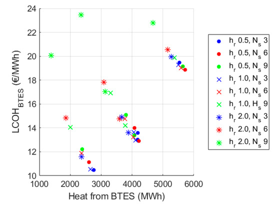 For the new storage-based heating system to be economically feasible, it needs to be competitive with the conventional heat generation system. According to district heating operators, a levelized cost of heat below 20 €/MWh would be preferable for widespread adoption [19]. For comparison, the after-tax consumer price for district heating in Helsinki in 2020 was 35–66 €/MWh [20]. Parametric runs were performed with various BTES configurations, to see how the economics changed. The variables were the volume of the rock used for storage (VBTES, 300,000 and 600,000 m3), the height-to-width ratio of the cylindrical storage (hratio, 0.5, 1.0 and 2.0 m/m), the areal density of boreholes (BH) on the BTES surface, i.e., how many boreholes per area (BH density, 0.05 and 0.10 1/m2) and the number of boreholes connected in series (Nseries, 3, 6, 9). The settings of the parametric runs are displayed in Table 1.