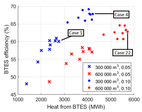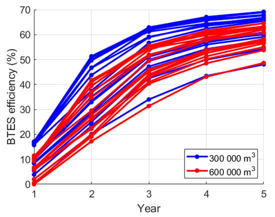 Figure 9 shows the annual BTES efficiency (fifth year) in all cases as a function of useful heat extraction.