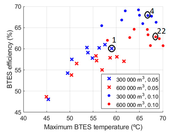 The BTES configuration influenced the temperature than can be obtained in the storage. Figure 10 shows the storage efficiency vs. the annual maximum temperature of the BTES.