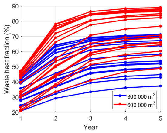 The attained efficiency range in all configurations was 48–69%, with a median of 61%. The highest efficiency was obtained in the small storage. The storage efficiency was generally greater in the small storage than in the large storage, but with a lower energy output. With all other things being equal, a large storage system should have a higher efficiency because of a more favorable surface area-to-volume ratio. However, this is also influenced by the heating demand. At the end of the heating season, the base temperature level remained higher in the large storage than in the small one. This increased the heat losses in the larger storage system. The small storage system was drained more completely, resulting in increased efficiency. It was more cost-effective to size the storage to cover a smaller part of the heating load. On the other hand, a larger storage was required to cover a larger part of heating demand by waste heat.