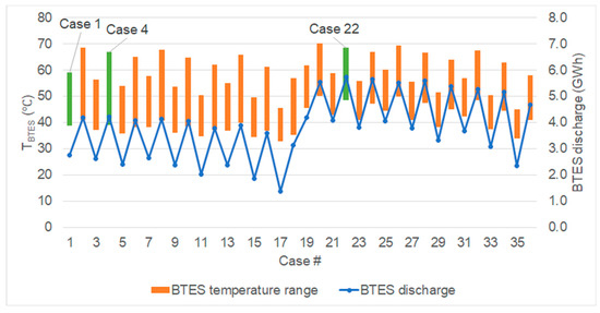 Figure 13 shows the operational temperature range in the BTES during the last year for all cases.