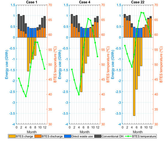 It showed how the utilization of stored waste heat increases changed from case 1 to 4 to 22 (waste heat utilization fractions 54%, 71% and 89%, respectively). This was related to the temperature of the BTES. In case 1, the BTES temperature remained below 58 °C and cooled down to 39 °C at the end of the heating season (in April). In case 4, more heat was charged to the ground, raising the peak temperature to 65 °C, while the minimum temperature remained at 40 °C. The increased charging and discharging potentials were caused by the doubling of the number of boreholes, which directly relates to heat transfer power. In case 22, the size of the BTES was doubled compared with the other two cases. Thus, more heat could be charged into the ground. In this case, the peak temperature rose still higher to 67 °C, while the minimum temperature also went up to 49 °C. A larger share of district heating could be displaced because the BTES remained at higher temperatures. In case 22, the energy injected during the first month of charging was more than three times the peak monthly demand in winter. This could be interpreted as there being significant overcapacity in the BTES, but it was mainly because the system was running constantly on full power during the charging period.