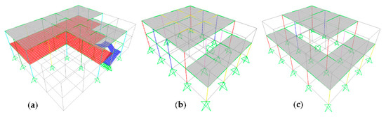 The software SAP2000 [24] was used to carry out the simulated design of the RC beams and the stairs (no infill masonry walls were included in the model, because there are not enough laboratory tests about the mechanical characteristics of the masonry walls that are presented in the “P3” schools). The adopted structural models are presented in Figure 7.