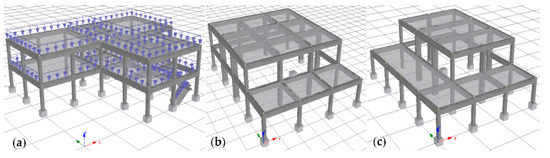 SeismoStruct structural models adopted for obtaining the capacity curves: (a) modules 1 and 2; (b) module 3; (c) module 4.