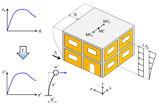 The EC8-1 establishes that it is necessary to consider three positions of the MC (to account for the accidental eccentricity) for each horizontal direction and two different patterns of force distribution (an “uniform” distribution, which is obtained by considering ϕi = 1, and a “modal” distribution, which in the present study was considered equal to shape deformation associated with the vibration mode with the highest participation factor in each direction), as schematized in Figure 9.