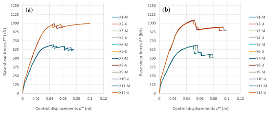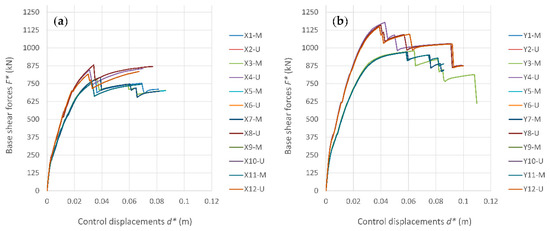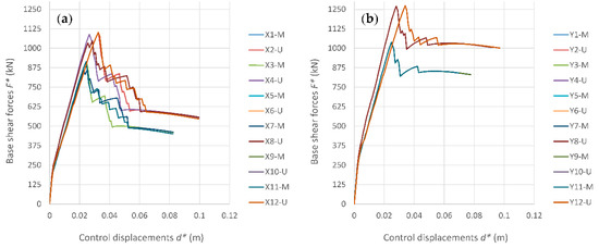 Capacity curves determined for the school module 4 (M—modal; U—uniform force pattern): (a) X direction; (b) Y direction.