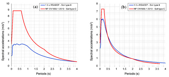 The Portuguese National Annex of Eurocode 8, NP EN 1998-1:2010 [29] became the new national seismic code in 2019. This new code presents an increase of the seismic action for the Algarve region, namely for the design of new school buildings, when comparing to the RSAEEP [23] (Figure 13), which was the former seismic code. One of the reasons for this increase is related to the importance factor, which is a value higher than one for school buildings in the new code. The other reason is related to a revision of the seismic hazard of the region [30], which led to an increase of the spectral ordinates due to a combination of the change of the agR that is established for the municipalities of the Algarve region, the increase of the soil factor (S), and because the period TC presents high values, increasing the plateau of the maximum spectral acceleration despite the design seismic action of the RSAEEP being multiplied by a factor of 1.5 (as defined in the code), which can be observed in Figure 13 for the two earthquake types that are established in both seismic codes.
