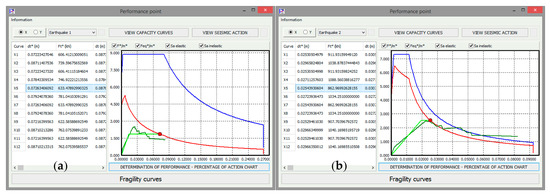 Example of the output of the developed software that computes the performance points for: (a) earthquake type 1; (b) earthquake type 2.