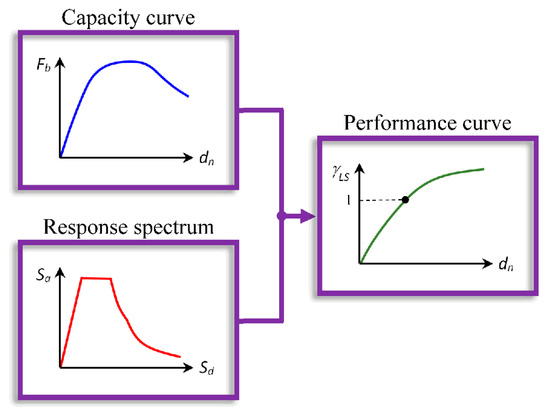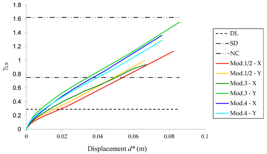 To better compare the performance of all the different structural modules of the studied “P3” school, the concept of performance curve was adopted [16], which corresponds to a curve representing all the performance points that are associated to a given capacity curve (), for different levels of the reference value of the seismic action, that is obtained by multiplying the agR by a coefficient (γLS), between 0 and 1 (Figure 16), which is computed using the expression (6).