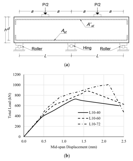 (a) Details of beam geometry and support conditions; (b) experimental total load-midspan displacement relations [9].