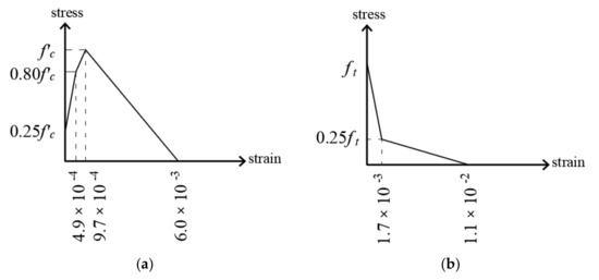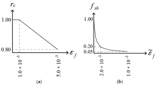 The concrete material model used in this study facilitates strength reduction for cracked concrete. The functions of reduction factors for compressive strength (rc) and shear strength (fsh) are presented in Figure 3. The reduction factor for compressive strength is affected by the fracturing strain (εf) determined from the strain tensor at the finite element integration points. The reduction factor for shear strength is affected by fracturing strain after localization () determined by Equation (1) [31].