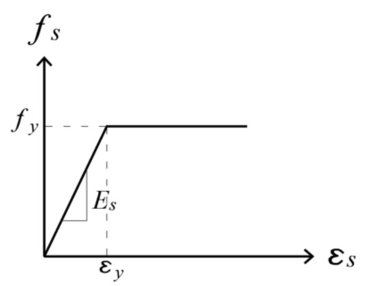 Tension and compression reinforcement were modeled as one-dimensional bar elements, and the steel material constitutive law was chosen as the elastic-perfectly plastic model with a perfect bond between concrete and steel bars. The steel stress-strain behavior is presented in Figure 4. The yielding strength of compression and tension steel (fy) is 420 MPa. The modulus of elasticity (E) for steel is 200 GPa and the strain at yielding (εy) is 0.0021. The chosen concrete and steel material models were used to simulate the performance of the continuous deep beams tested by Yang et al. [9] using ATENA software [31]. A mesh sensitivity study was carried out to warrant solution convergence during the numerical analysis of the tested beam while minimizing the computational time. To find the best model mesh, different element sizes were tried prior to choosing the mesh layout exhibited in Figure 5.
