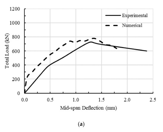 The numerical total loads and their corresponding mid-span deflections as well as the test total loads and their corresponding mid-span deflections are summarized in Table 3 for comparison.