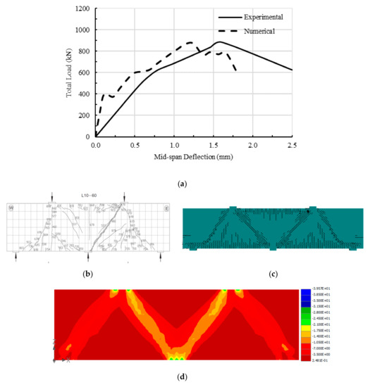 However, the failure load predicted by the numerical model was 871 kN and the test failure load was 883 kN. Both numerical and test total loads were almost the same. On the other hand, as the deflection increased, the numerical behavior got closer to the test behavior. The numerical and experimental total failure loads were both reached at deflections of 1.3 mm and 1.6 mm, respectively. The same as for specimen L10-40, Figure 7b,c show that the two spans displayed just about the same numerical and test crack patterns. More shear and flexural cracks were generated and spread as the load increased, although less than the cracks developed in specimen L10-40, and a main shear crack in the right span of the test beam was developed at the failure load, linking the ends of the loading plate and interior support plate. Similar to Figure 6, Figure 7b,c also demonstrate that the loads in the two spans are transmitted to the supports through the diagonal paths of compressive struts. Similar to Figure 6d, the stress distribution, shown in Figure 7d, indicates that the stresses in the interior struts were higher than those of the exterior struts. As a result, the interior shear span failed first, which was in accordance with the experimentally observed failure; Figure 7b.