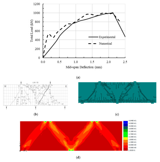 The generated 3D numerical model was assessed by comparing its outcomes with the test results obtained by Yang et al. [9]. Figure 6 shows the experimental and numerical load-deflection relations and crack patterns in specimen L10-40. Figure 6a indicates that the numerical stiffness of the specimen was almost double the test stiffness in the pre-cracking stage. This discrepancy in the performance may be credited to the heterogeneous nature of concrete, resulting in different material properties between the tested specimens and those specified numerically. Other possible factors might be the initial micro cracks generated in concrete due to the temperature and shrinkage effects that were not possible to define numerically. These possible factors are in agreement with conclusions reported by Ibrahim and Mahmood [36] and Obaidat et al. [37]. Following cracking, the numerical stiffness of the specimen decreased and became almost the same as the test stiffness, and both numerical and test deflections increased at nearly the same rate, until both behaviors reached a load of 724 kN, which was a failure total load for the test specimen. The numerical behavior, however, showed that the specimen exhibited a plastic performance as the load increased where the deflection continued to increase rapidly associated with a small increase in the load until a total failure load of 781 kN was reached. As for the test behavior, the development of diagonal cracks caused the beam stiffness to decrease leading the beam to deflect at a higher rate. Nonetheless, the numerical and experimental total failure loads were both reached at deflections of 1.4 mm and 1.3 mm, respectively. Figure 6b,c show that the two spans displayed practically the same numerical and test crack patterns. More shear and flexural cracks were generated and spread as the load increased, and a main oblique shear crack in the left span of the test beam abruptly occurred at the failure load linking the ends of the loading plate and interior support plate. This is in agreement with the numerically predicted crack pattern manifested in the wide diagonal crack width band. Figure 6b,c also show that the loads in the two spans are transmitted to the supports through the diagonal paths of compressive struts. The stress distribution, shown in Figure 6d, indicated that the stresses in the interior struts were higher than those of the exterior struts. As a result, the interior shear span failed first, which was in accordance with the experimentally observed failure; Figure 6b.