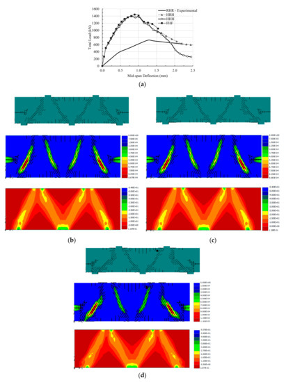 Figure 11b–d show the crack patterns, crack widths, and stress distributions for the three numerical support sets. The crack patterns in the three sets show dominant diagonal shear cracks with narrow bandwidth and, remarkably, very little and very minor sagging and hogging flexural cracks. This was not the case for the specimen L10-72 with test RHR support conditions, as shown in Figure 8c. It is worth noting that for the cases of HRH and HHH support sets, the crack patterns are identical to those demonstrated in Figure 11b,c; however, when the FHF support set was used, the sagging flexural cracks almost disappeared with exception of couple of minor cracks and the hogging flexural crack did not change much, while the cracks at the exterior fixed supports were amplified; Figure 11d. Furthermore, Figure 11b–d demonstrate that at failure, the crack widths in the diagonal struts of exterior shear spans were larger than those of interior shear span diagonal struts. Similarly, the stress distributions presented in these figures demonstrate that the stresses in the diagonal struts of exterior shear spans were higher than those of the interior shear span diagonal struts. Hence, the beam exterior shear span failed first.