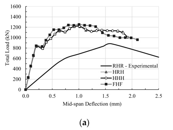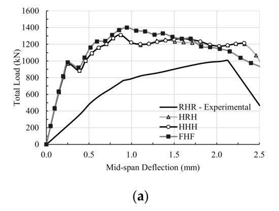Figure 9, Figure 10 and Figure 11 also show that each one of the specimens exhibited nearly identical behavior, indicating that using different restraining support sets (HRH, HHH, and FHF) did not significantly affect the beam behavior. However, the specimens revealed much higher total load capacity and gained better stiffness than they did experimentally with a set of RHR support conditions.