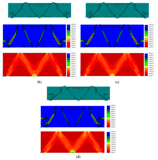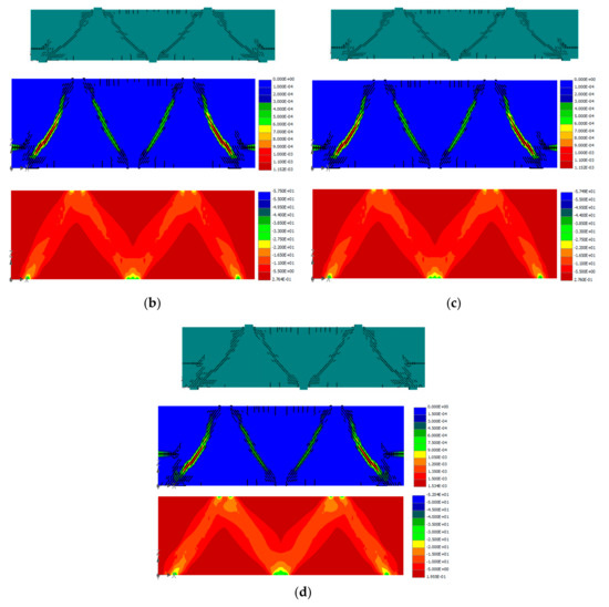 The numerical simulations showed that the major cracks in any of the specimens with any of the HRH, HHH, or FHF support types were parallel, with diagonal cracks connecting the edges of loading plates to the edges of supporting plates. It is worth noting that as the beam depth increased, the diagonal shear crack bandwidth narrowed and the shear cracks became more localized diagonally, while the sagging flexural cracks degenerated, and the hogging flexural cracks were converted into insignificant cracks.